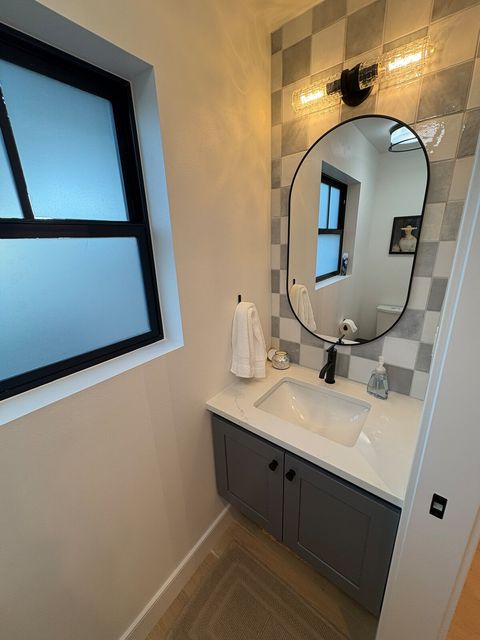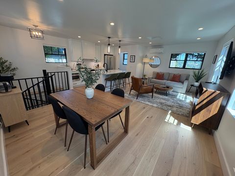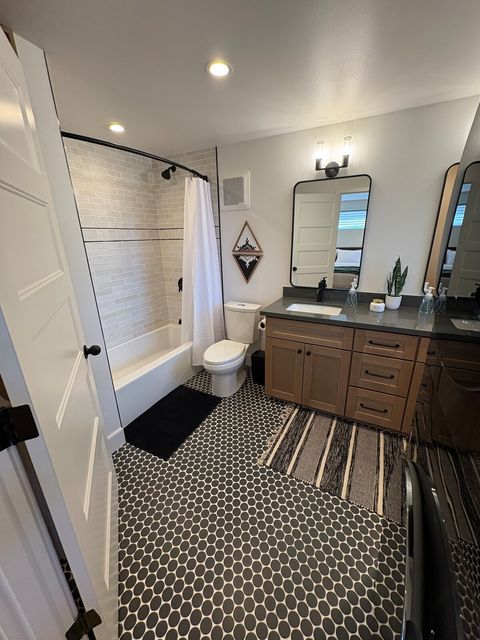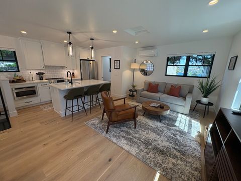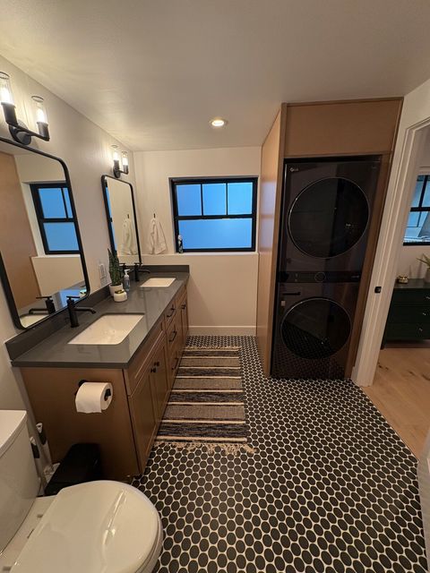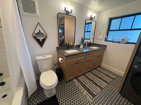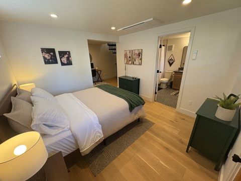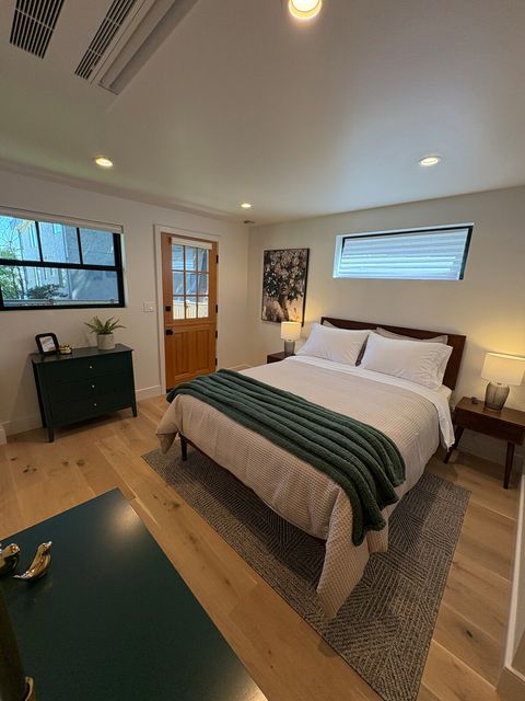 1 bedroom with queen bed & full bath. Full/Double sleeper sofa in living area. Kitchen with all the amenities. Half bath on main floor. Full sized washer & dryer. Office space. Fully fenced back yard with turf grass, bbq & fire table. Dog bed, food & water bowls provided.